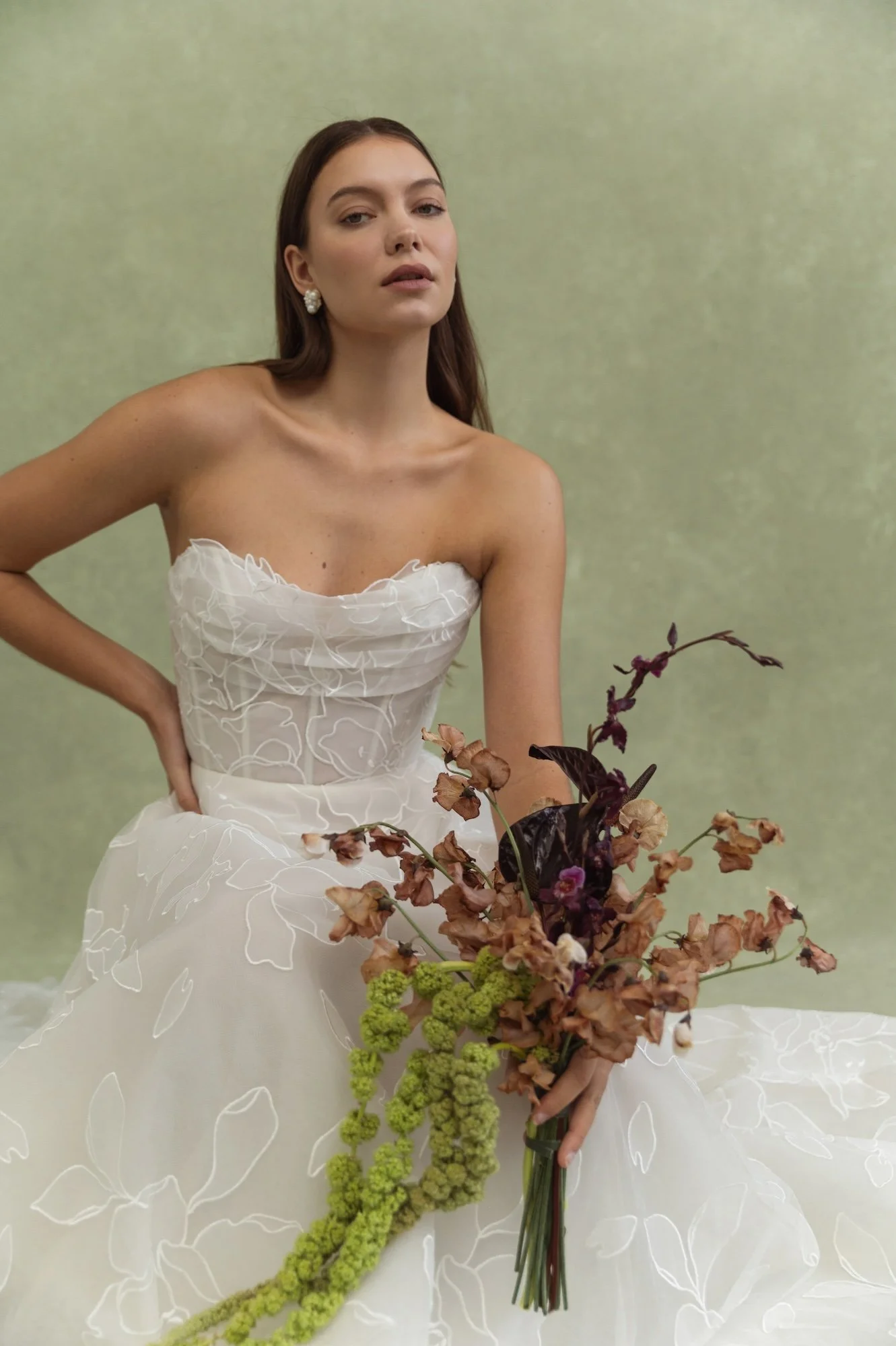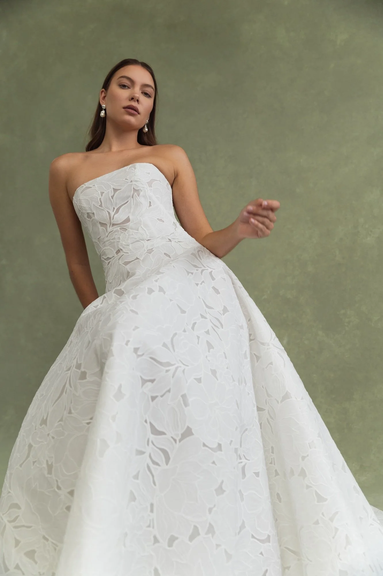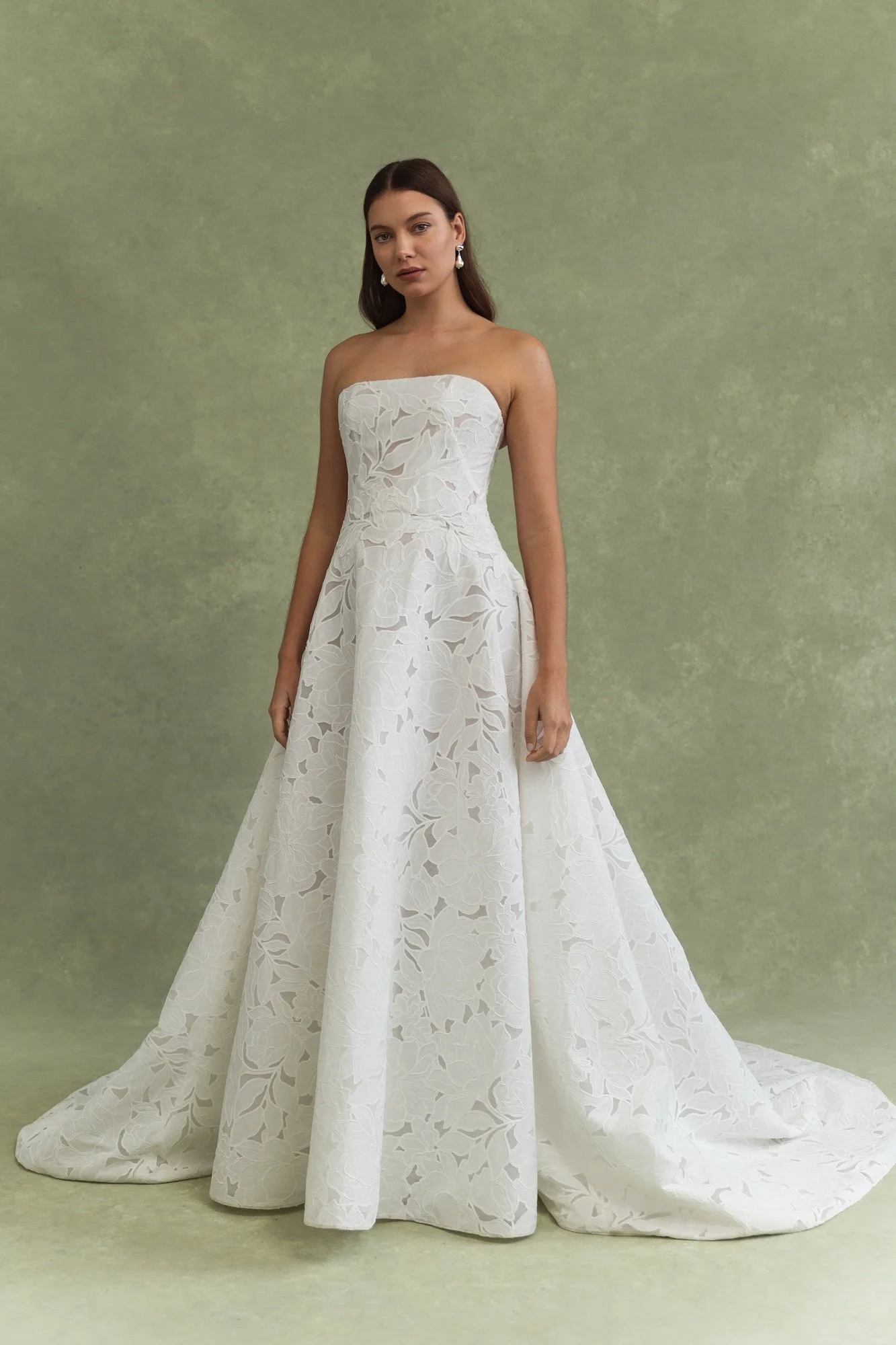 We love it when designers use a unique fabric, it's always refreshing to have something stand out in the boutique! Perfect for brides who love a clean and simple silhouette but want to feel elevated with an intricately textured fabric. Her sleek straight neckline and subtle drop waist are made all the more striking by the cut outs in the oversized floral motif for just a hint of sheerness peeking through. A lovely blend of classic and playful.
