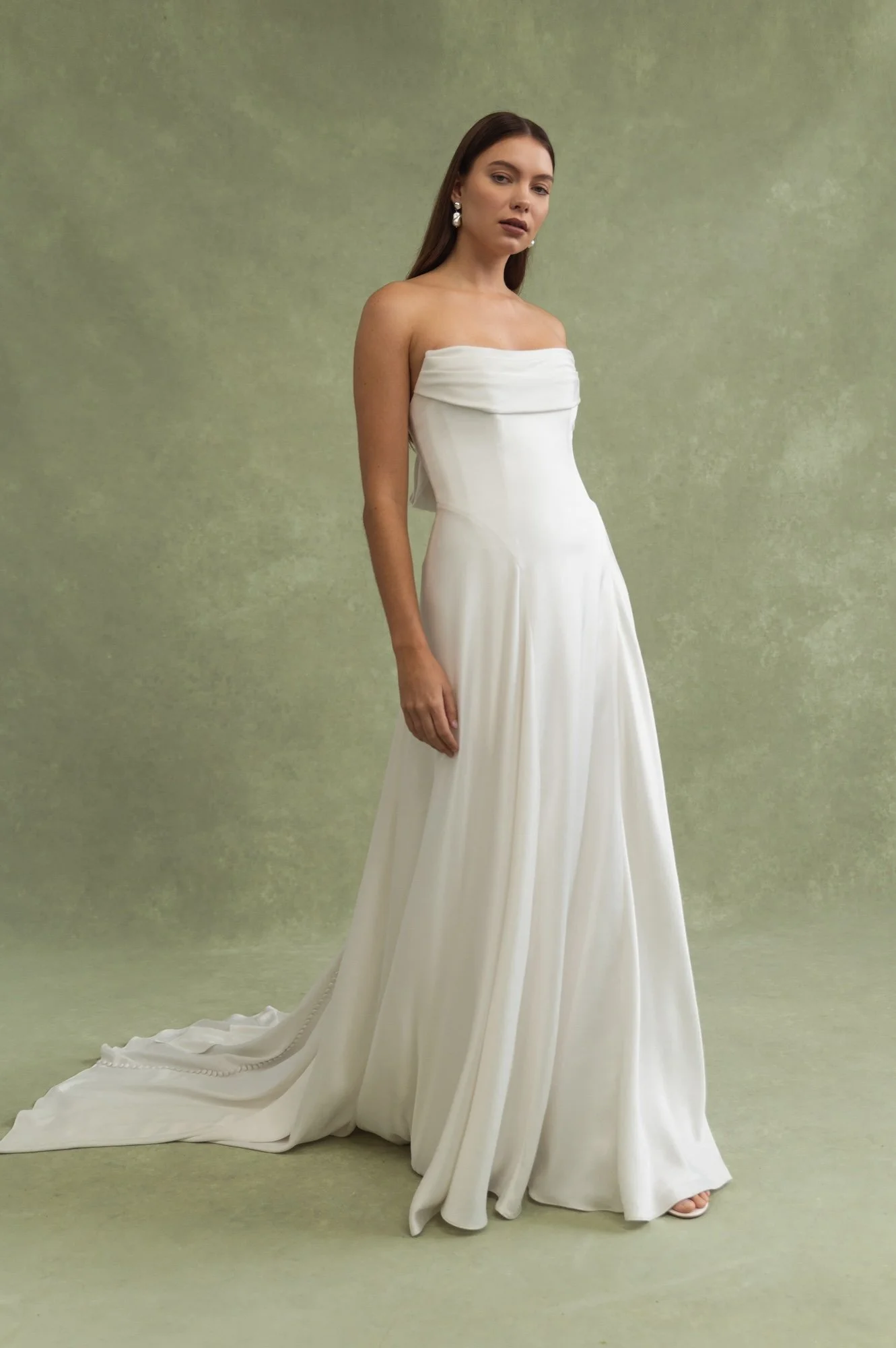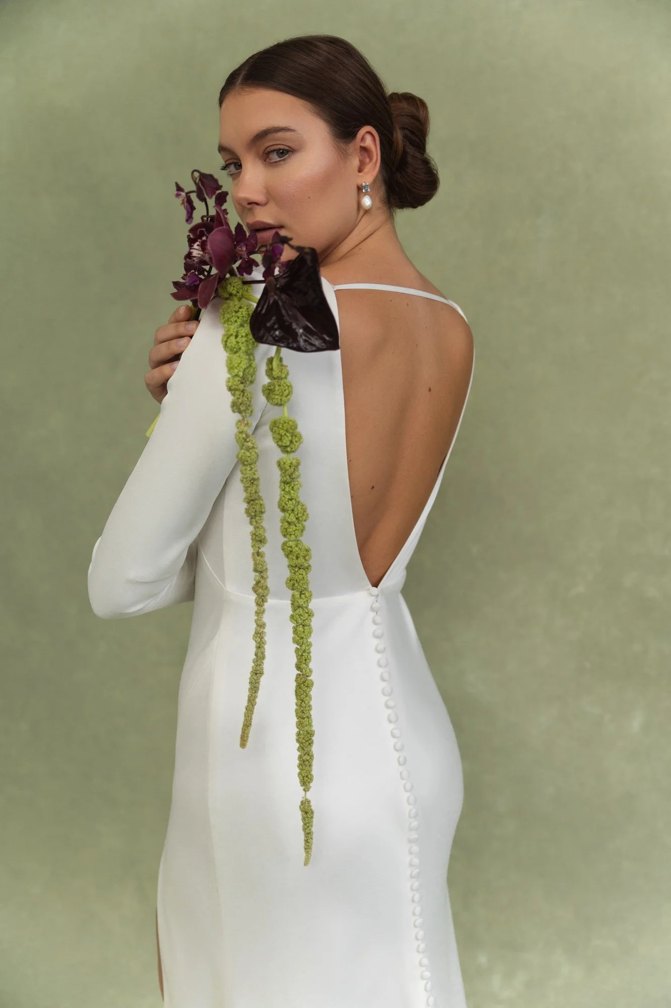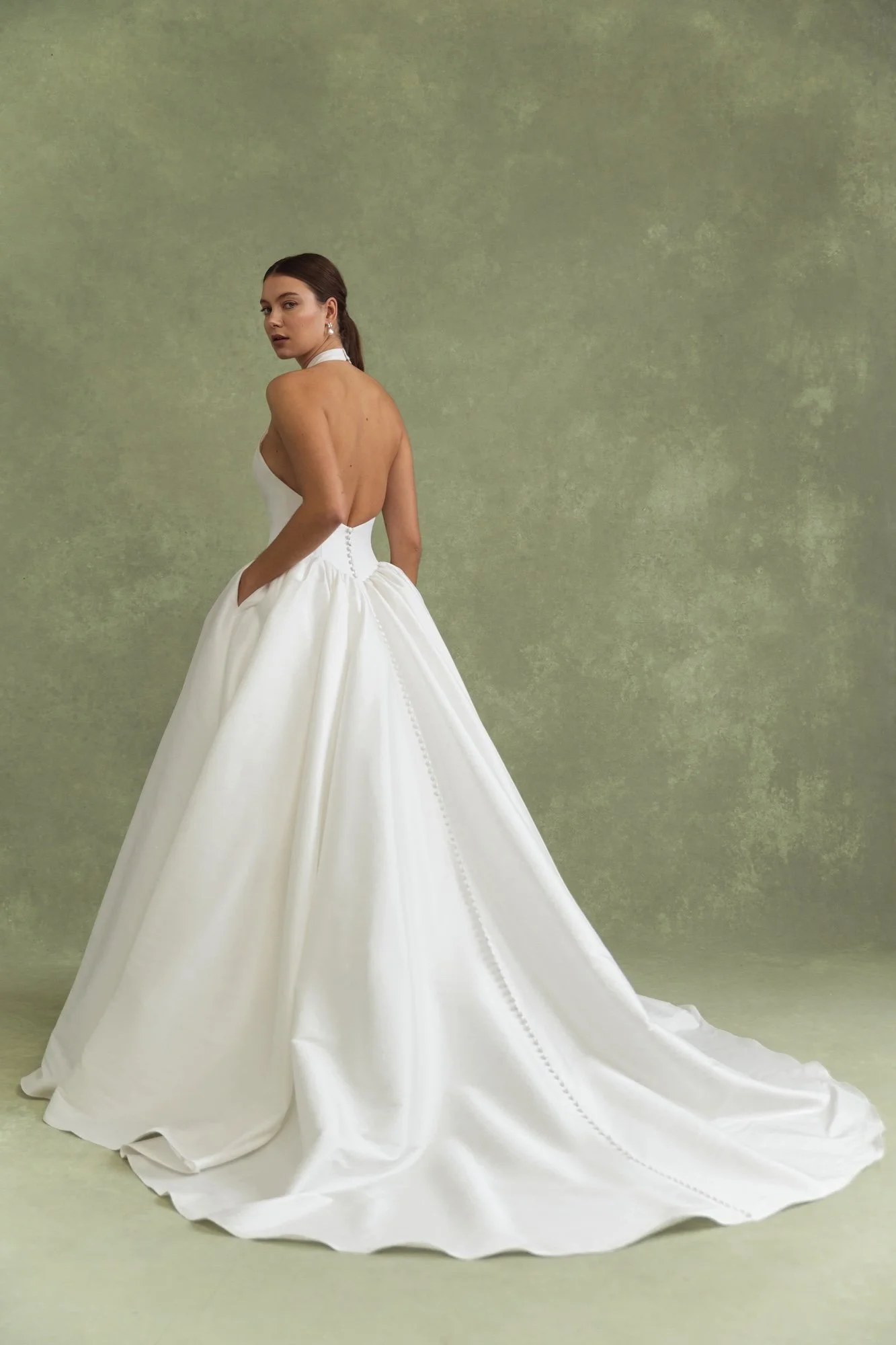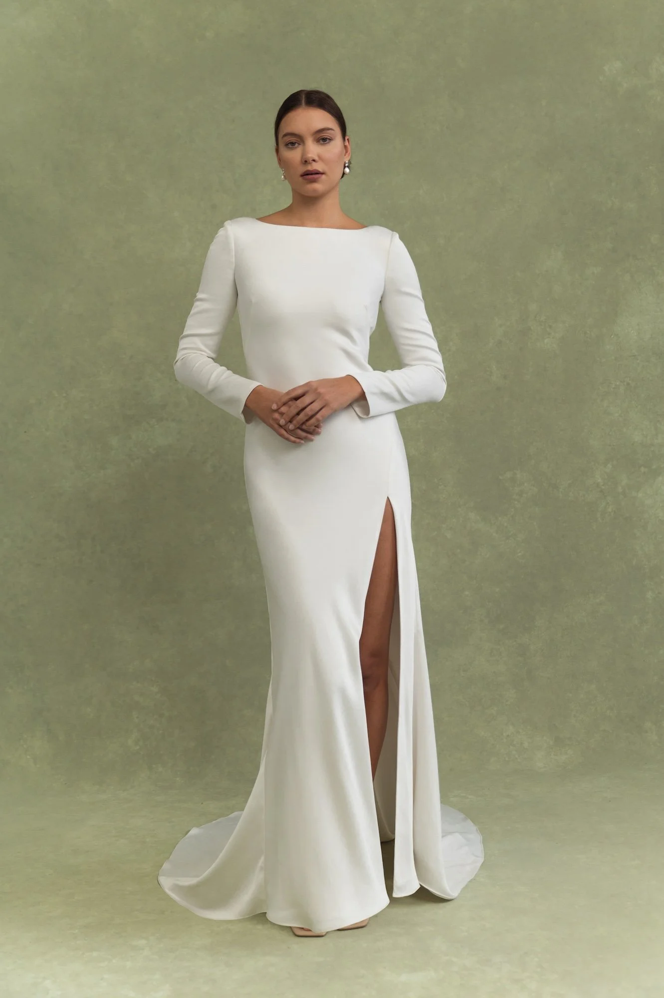 Utterly sleek and elegant, Taylor is a beautiful option for brides who want to have more coverage at the front and openess at the back. The buttons that run all the way down to the end of the train add extra details for that wow as you walk down the aisle. We love a long sleeve option for winter weddings. Taylor would also be beautiful for a civil ceremony or engagement