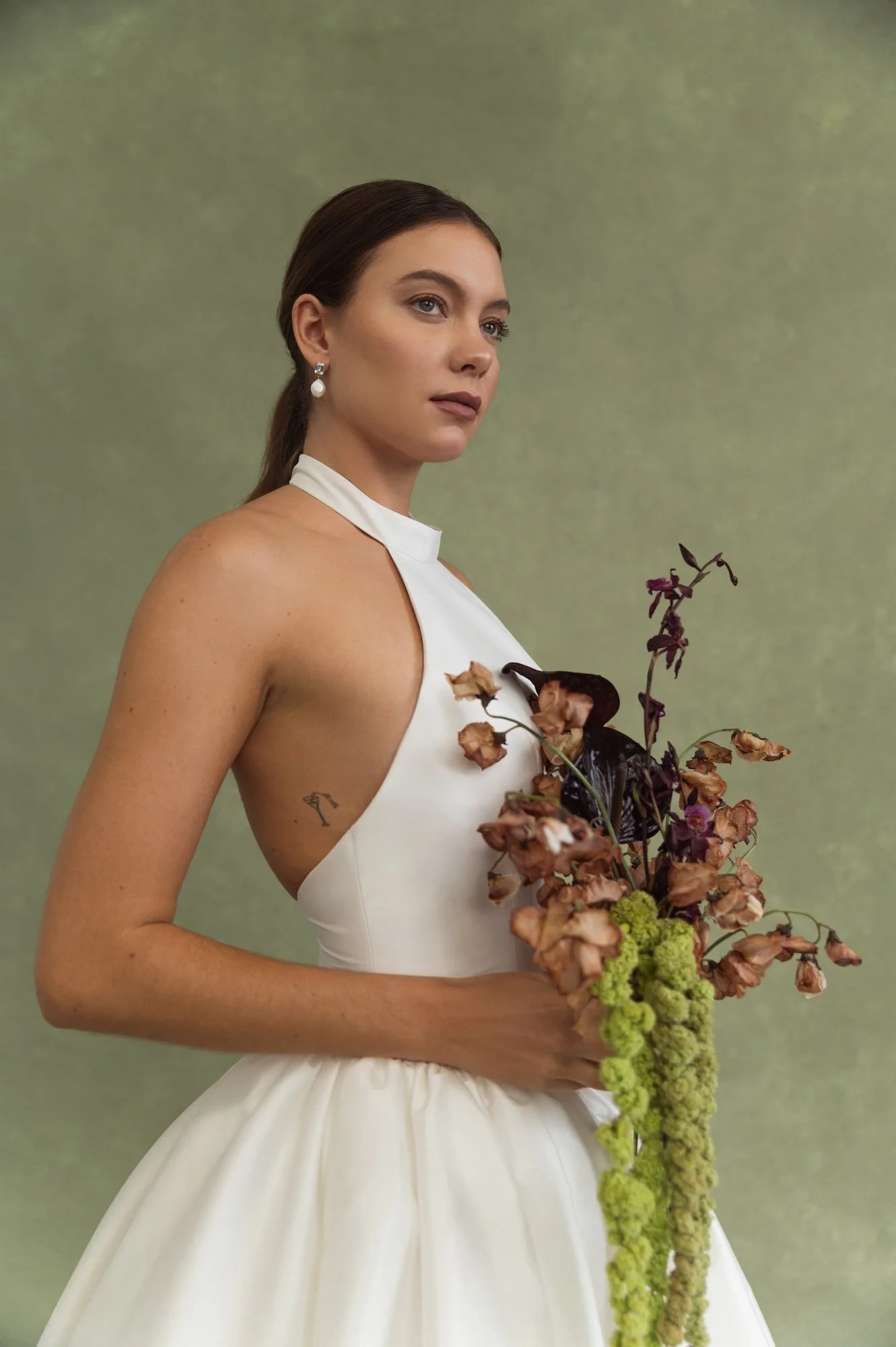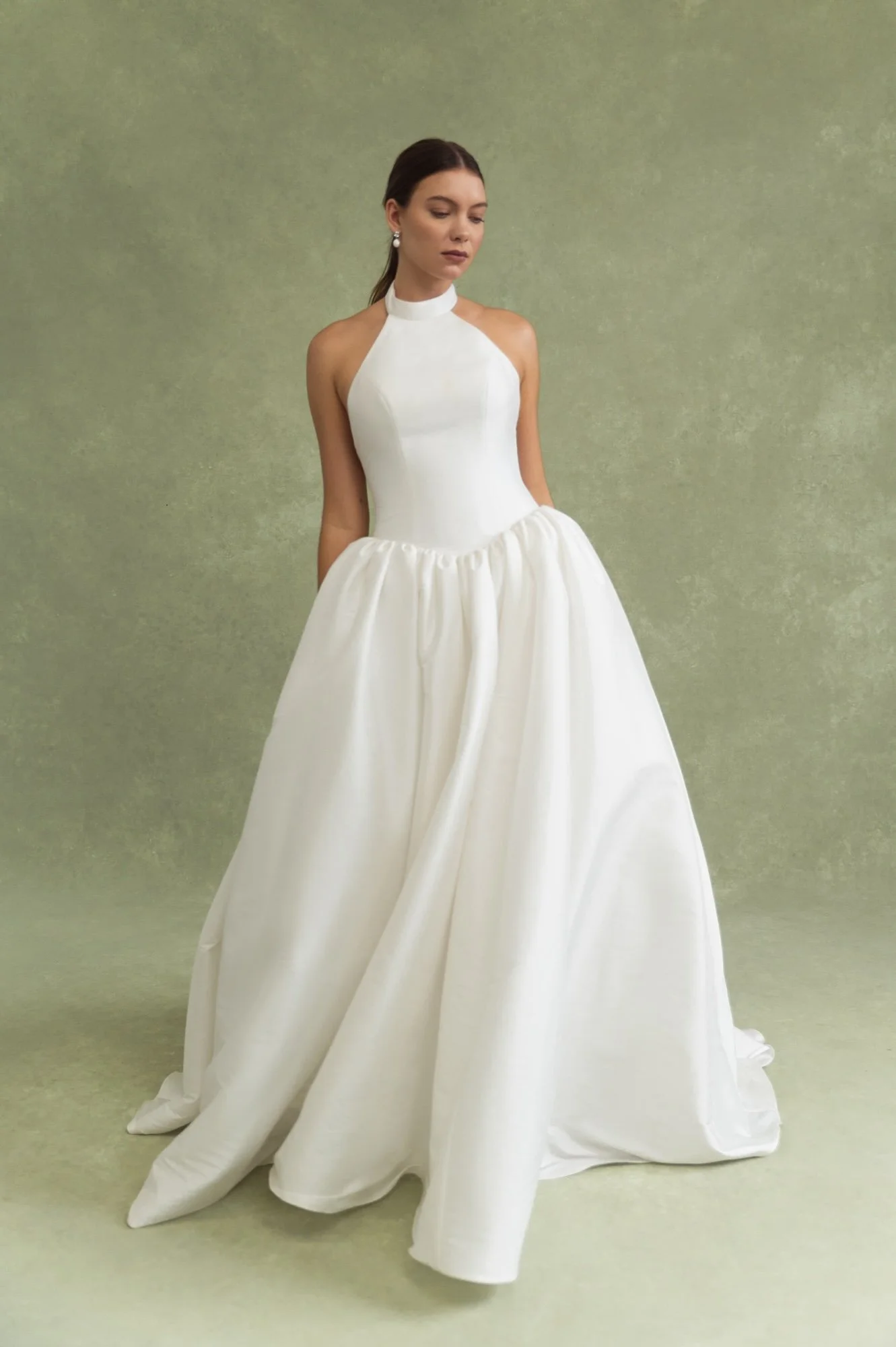 The Blake gown is a true show stopper. Her striking high neckline, sculpted Basque waist, low open back, and dramatically full ball skirt make her timeless, elegant, and playfully feminine. We imagine her in a castle setting paired with a sleek back bun, long flowing veil and pointed satin shoes. Dreamy.