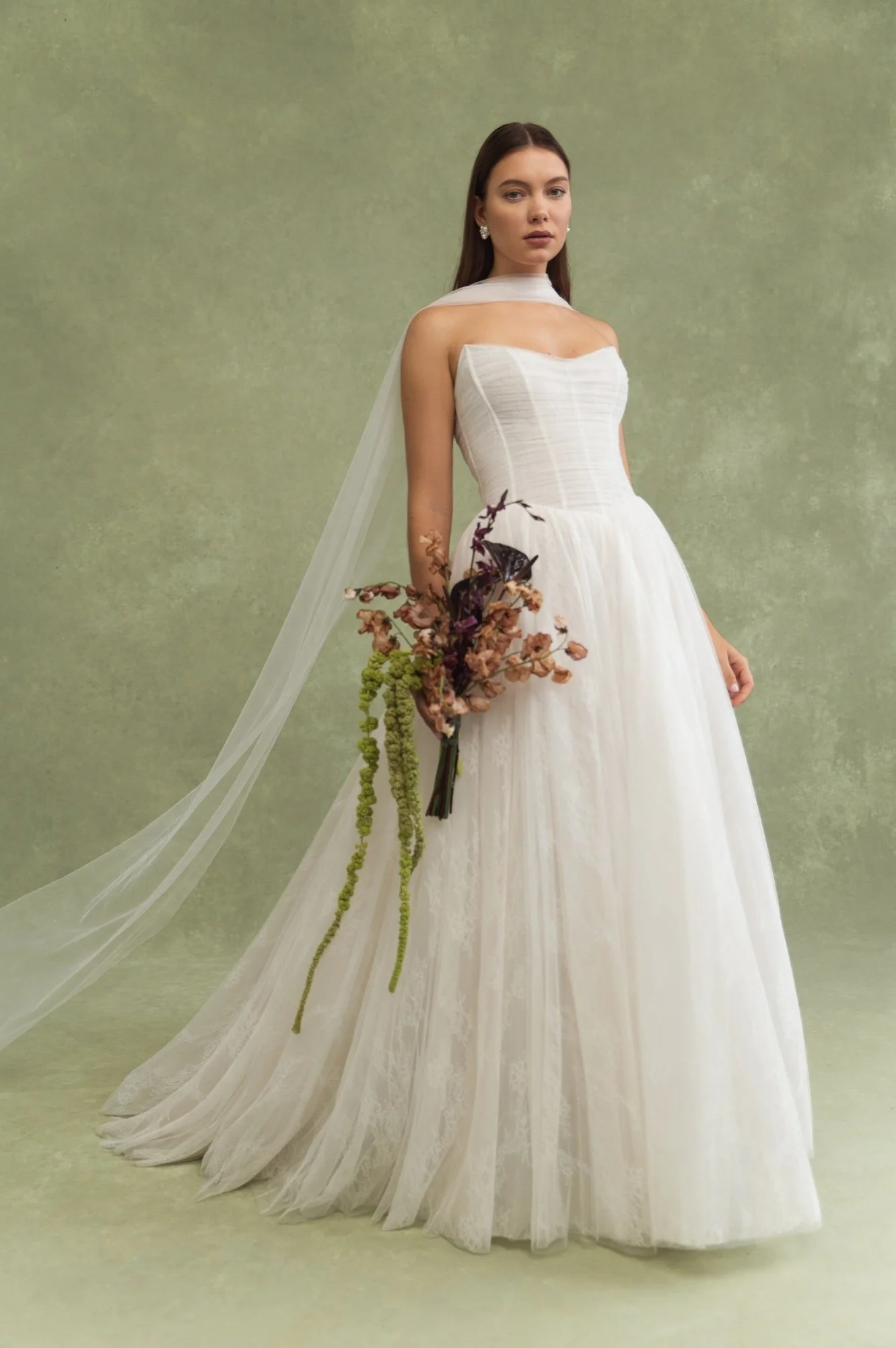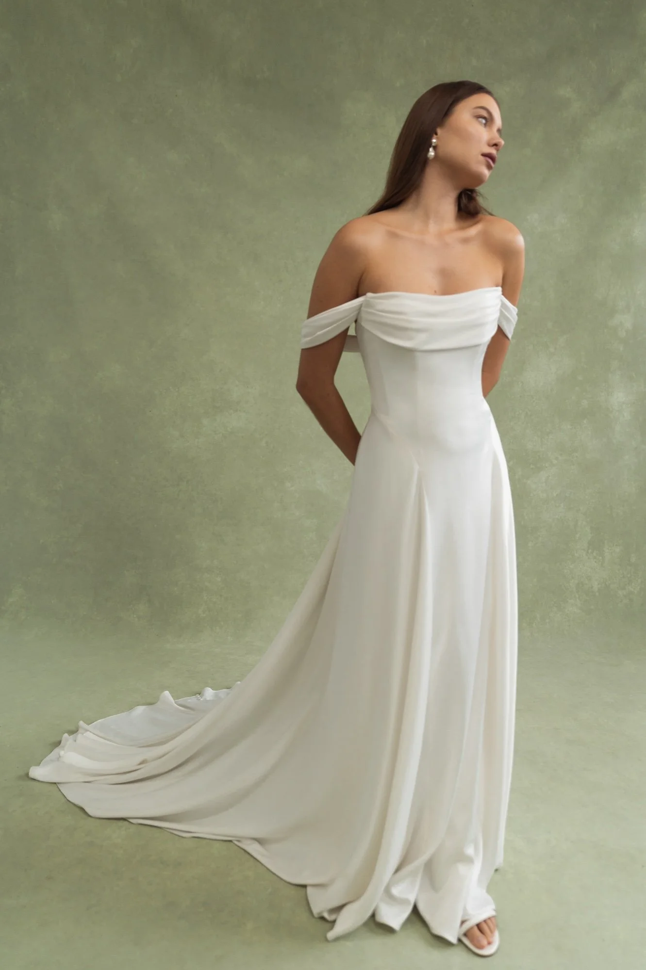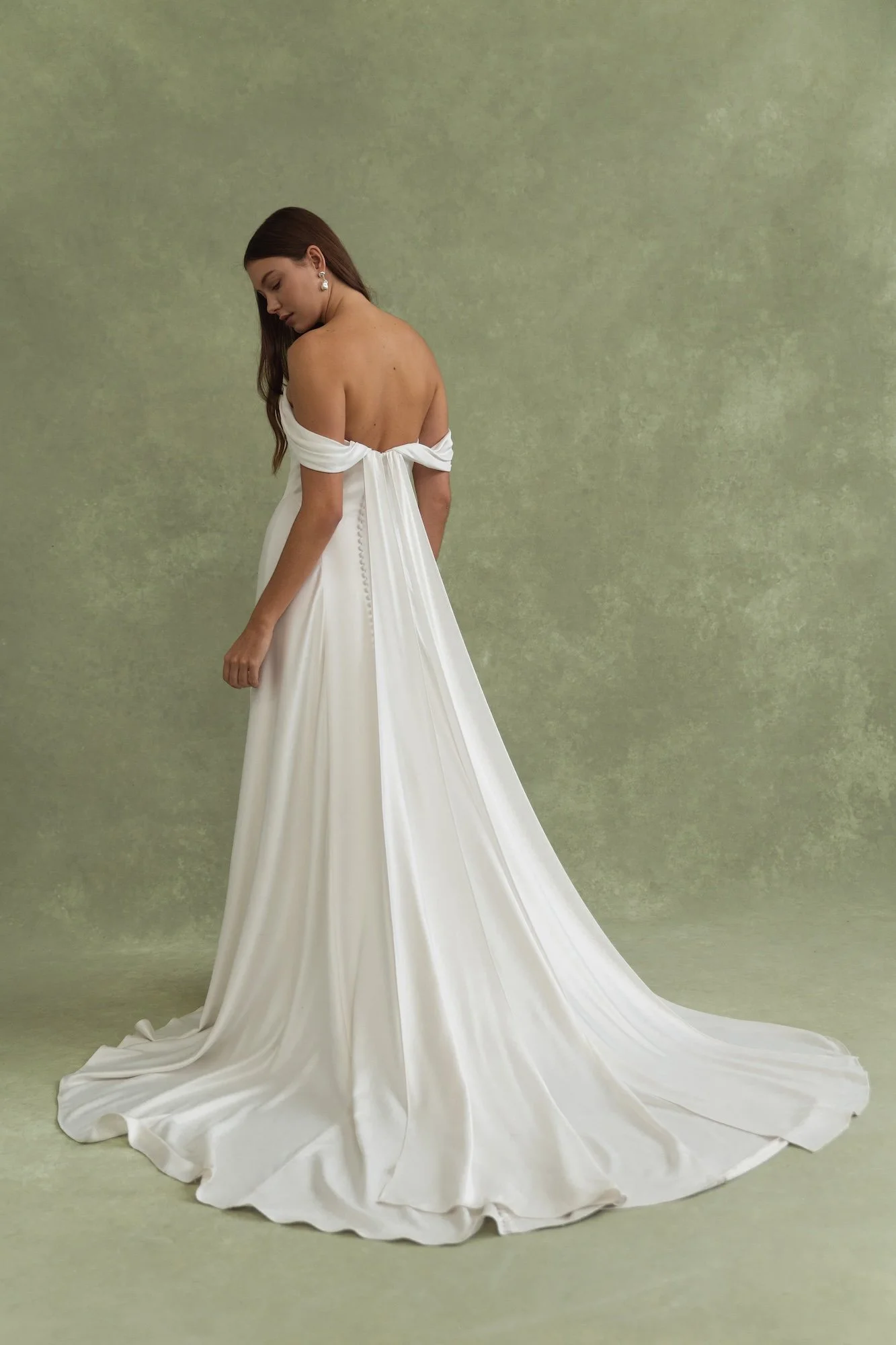 Lee is inspired by the ever popular Addilyn gown - she takes the same silhouette but adds feminine details along the bust and detachable off shoulder streamers. Draping over the bodice beautifully frames your decolletage, and detachable swag sleeves and streamers lend even more romance and whimsy.